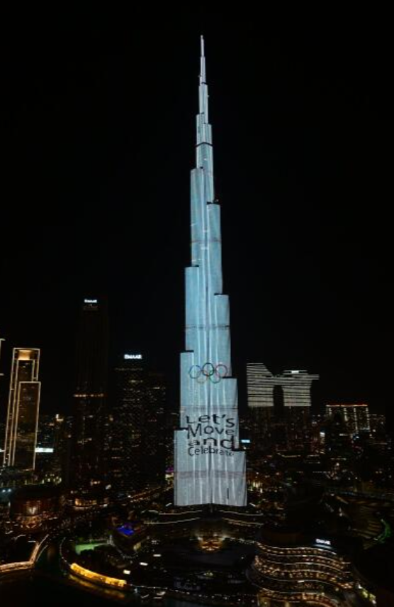 The world’s tallest tower shone brightly with the games logo and the colours of its five rings